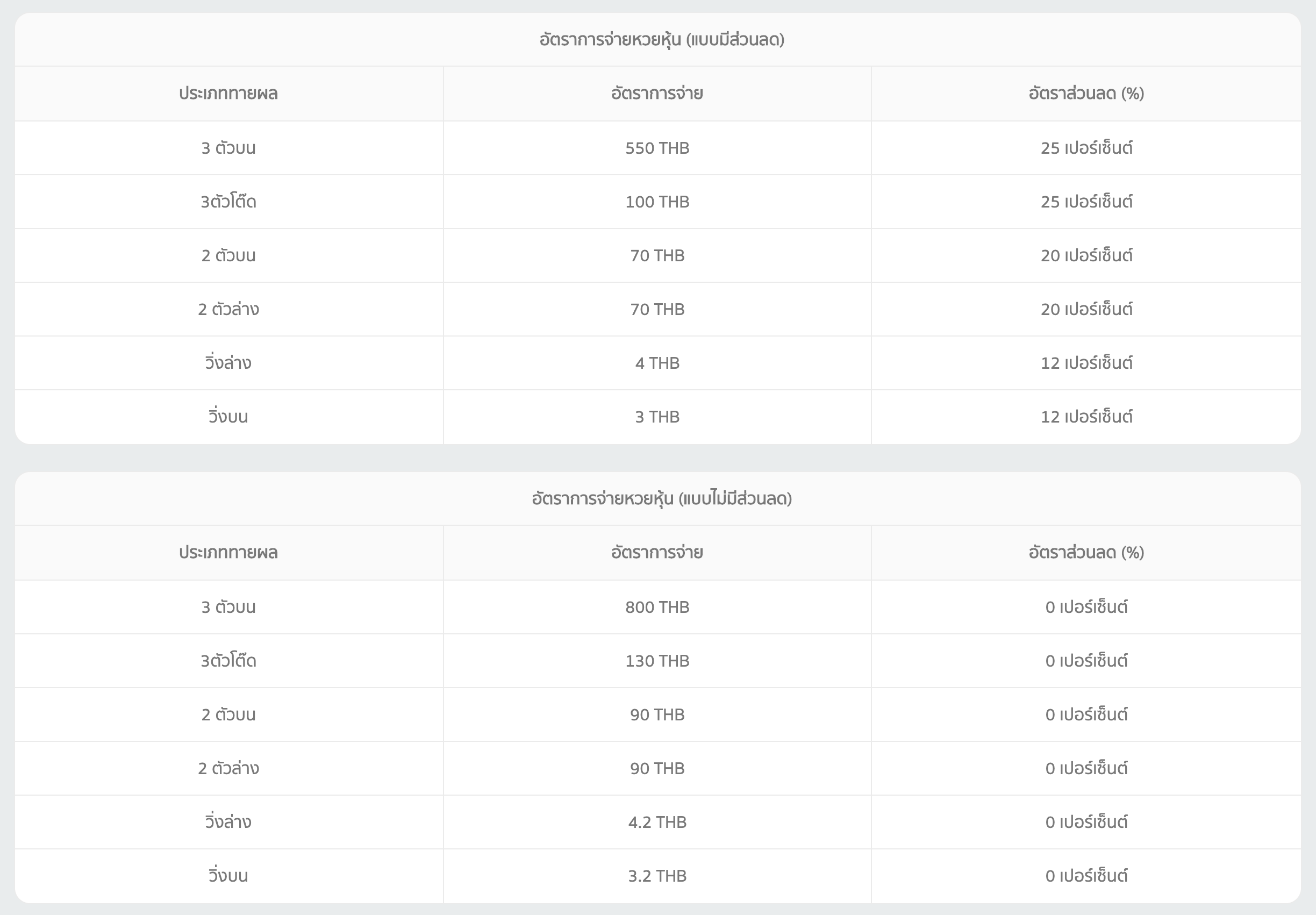 หวยรัสเซีย สามารถเล่นได้ 6 แบบด้วนกัน คือ 3 ตัวบน, 3 ตัวโต๊ด, 2 ตัวบน, 2 ตัวล่าง, วิ่งล่าง, วิ่งบน ซึ่งแต่ละรูปแบบก็มีอัตราการจ่ายที่มากน้อยแตกต่างกันออกไป ตามตารางด้านล่างนี้ ทั้งแบบมีและไม่มีส่วนลด สำหรับลูกค้าที่แทงหวยออนไลน์กับเว็บ SSSLOTTO.COM