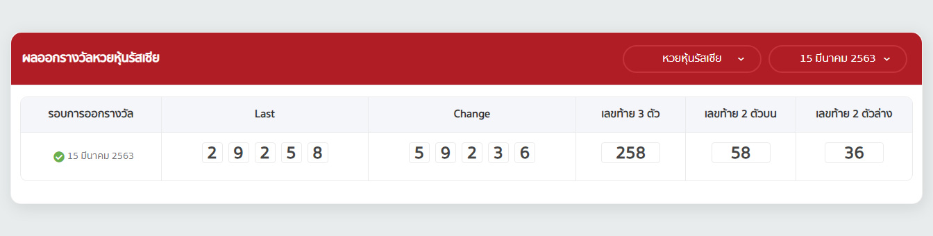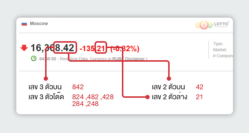 ในการออกผลหวยหุ้นรัสเซีย คือจะนำเลข หลักหน่วยและจุดทศนิยมของ ค่าปิดตลาด มาออกรางวัล 3 ตัวบน และนำจุดทศนิยมของ ค่า Change มาออกรางวัล 2 ตัวล่าง