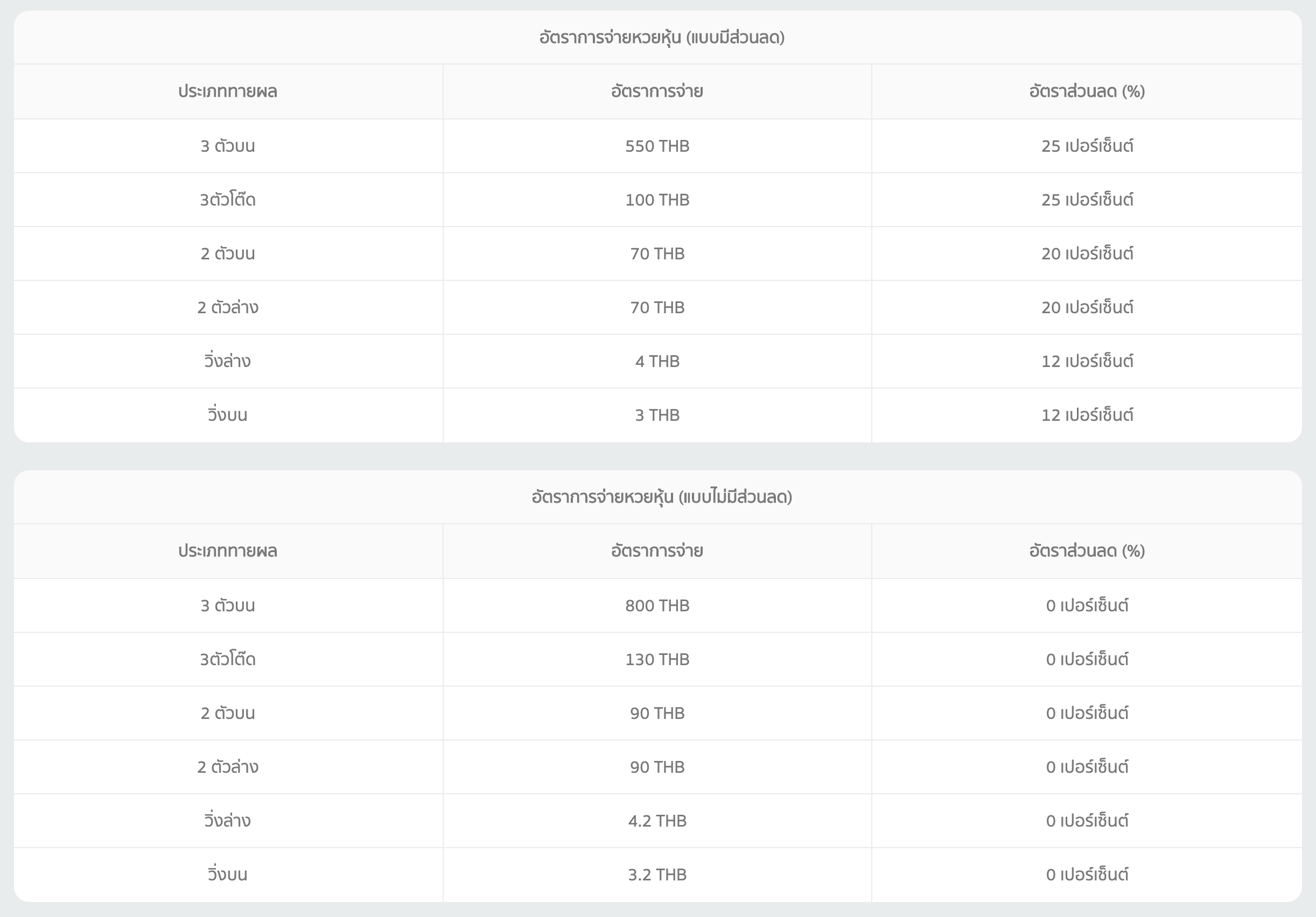หวยหุ้นอียิปต์ สามารถเล่นได้ 6 แบบด้วนกัน คือ 3 ตัวบน, 3 ตัวโต๊ด, 2 ตัวบน, 2 ตัวล่าง, วิ่งล่าง, วิ่งบน ซึ่งแต่ละรูปแบบก็มีอัตราการจ่ายที่มากน้อยแตกต่างกันออกไป ตามตารางด้านล่างนี้ ทั้งแบบมีและไม่มีส่วนลด สำหรับลูกค้าที่แทงหวยออนไลน์กับเว็บ SSSLOTTO.COM