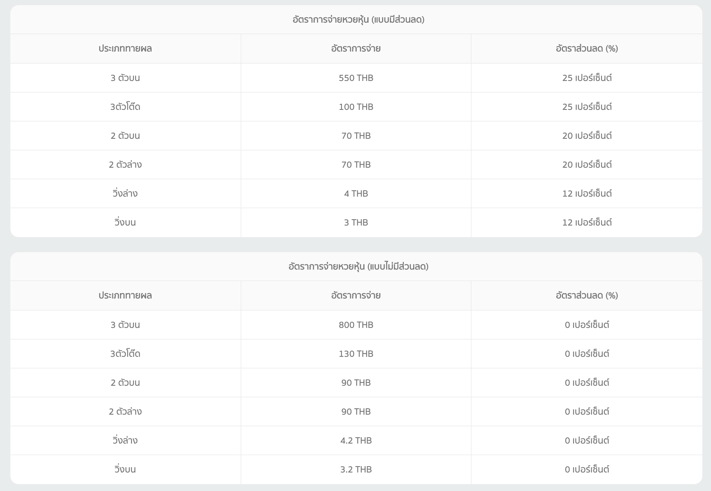 หวยหุ้นเยอรมัน สามารถเล่นได้ 6 แบบด้วนกัน คือ 3 ตัวบน, 3 ตัวโต๊ด, 2 ตัวบน, 2 ตัวล่าง, วิ่งล่าง, วิ่งบน ซึ่งแต่ละรูปแบบก็มีอัตราการจ่ายที่มากน้อยแตกต่างกันออกไป ตามตารางด้านล่างนี้ ทั้งแบบมีและไม่มีส่วนลด สำหรับลูกค้าที่แทงหวยออนไลน์กับเว็บ SSSLOTTO.COM